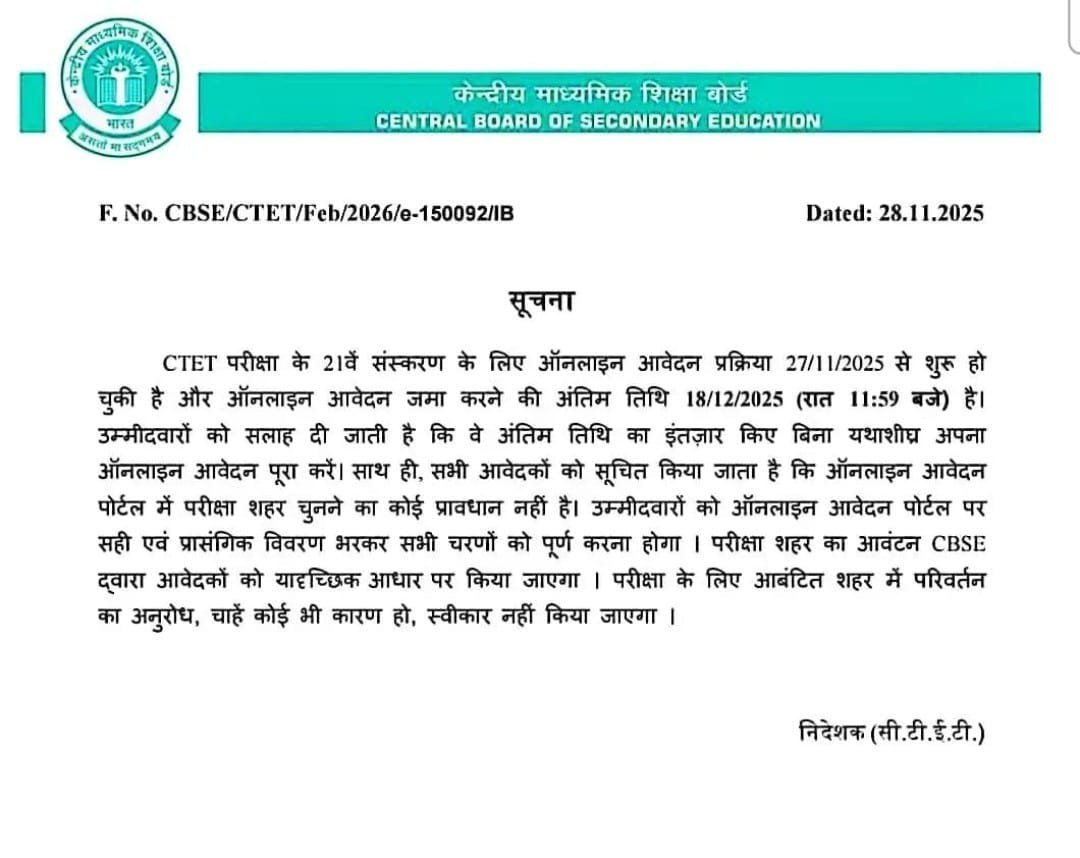 सीबीएसई की ओर से जारी किए गए नोटिफिकेशन के अनुसार सीटीईटी परीक्षा के लिए ऑनलाइन आवेदन की प्रक्रिया 27 नवंबर से शुरू हो चुकी है और ऑनलाइन आवेदन करने की अंतिम तिथि 18 दिसंबर 2025 तक रखी गई है। ऐसे उम्मीदवार जो आवेदन करना चाहते हैं, उन्हें सलाह दी जाती है कि वह अंतिम तिथि का इंतजार किए बिना जल्द से जल्द अपना ऑनलाइन आवेदन कर दें। इसके साथ-साथ नोटिस में यह भी कहा गया है कि आवेदकों को सूचित किया जाता है कि ऑनलाइन आवेदन सही एवं प्रासंगिक विवरण भरकर सभी चरणों को पूरा कर लें। सबसे महत्वपूर्ण बात परीक्षा शहर को लेकर कही गई है। परीक्षा शहर का आवंटन सीबीएसई द्वारा आवेदकों को आवंटित किया जाएगा। परीक्षा के लिए आवंटित शहर में परिवर्तन का अनुरोध, चाहे कोई भी कारण हो, स्वीकार नहीं किया जाएगा।